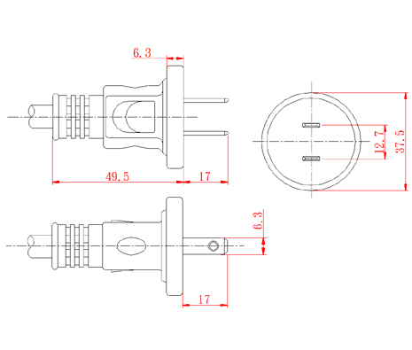 Japan 2-Pin Non-Grounded, Straight AC Plug, 7~15A 125V